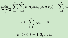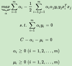 这就是软间隔最大化时的线性可分SVM的优化目标形式,和上一篇的硬间隔最大化的线性可分SVM相比,我们仅仅是多了一个约束条件0≤αi≤C。我们依然可以通过SMO算法来求上式极小化时对应的α向量就可以求出和w和b。