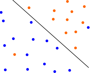 有时候本来数据的确是可分的,也就是说可以用线性分类SVM的学习方法来求解,但是却因为混入了异常点,导致不能线性可分,比如下图,本来数据是可以按下面的实线来做超平面分离的,可以由于一个橙色和一个蓝色的异常点导致我们没法按照(机器学习(7)之感知机python实现)中的方法来分类。