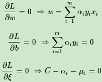 首先我们来求优化函数对于w,b,ξ的极小值,这个可以通过求偏导数求得: