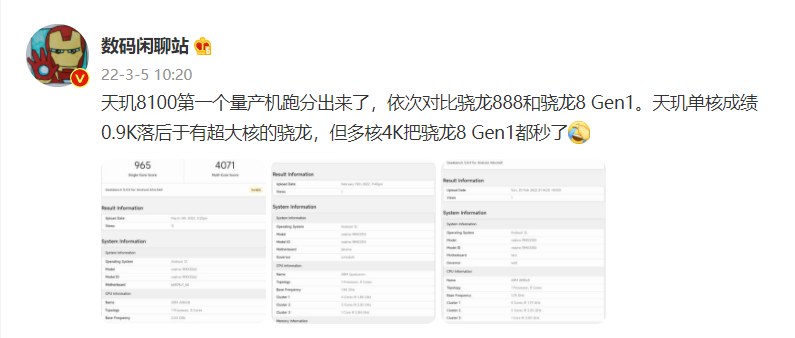 对比搭载骁龙 8Gen1 的 realme RMX3310 新机来看,天玑 8100 的单核成绩落后于高通旗下的骁龙 8 Gen 1,原因为骁龙 8 Gen 1 拥有超大核,但多核成绩要远胜于高通(RMX3310 跑分为 1129 分和 3538 分)。