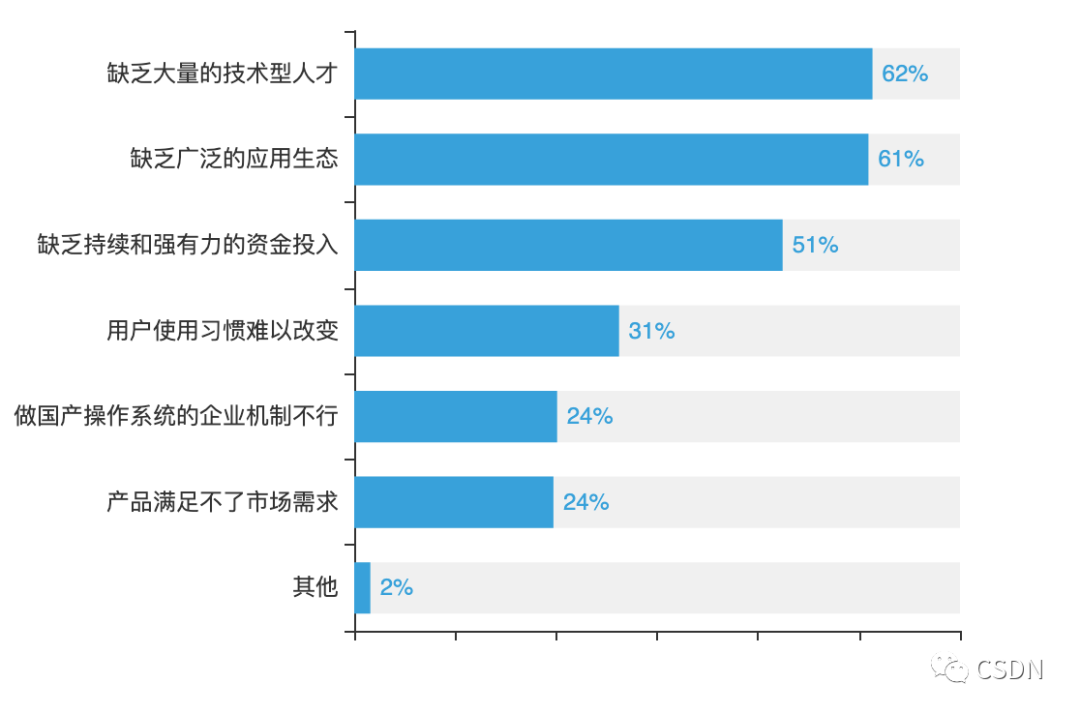 开发者普遍认为,技术型人才和应用生态在国产操作系统中占据重要地位,也是制约国产操作系统发展的两大因素,此外,操作系统的研发需要强有力的资金投入,也是许多人认可的第三因素。