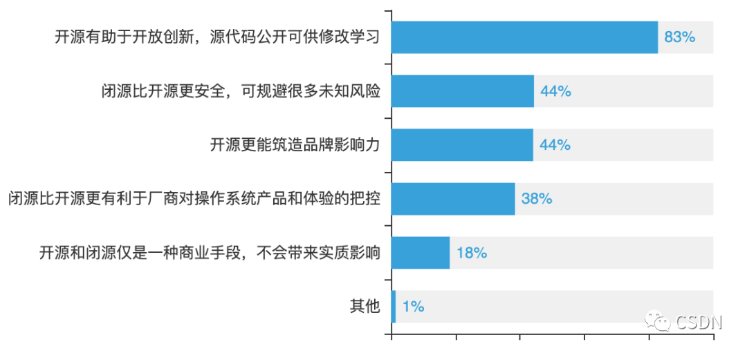 此外,83%的开发者认为,开源对操作系统的发展有重要影响,有助于开放创新,源代码公开可供修改学习。