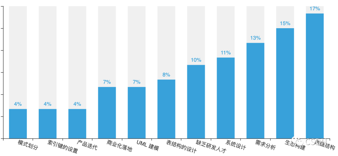 稳定、安全是众多开发者对数据库的要求,分别占比56%、53%。对于数据库的实时处理和数据强一致性,也是开发者看重的数据库能力。而针对数据库的研发难点,17%的开发者表示数据结构最难攻克,其次为生态构建(15%)、需求分析(13%)、系统设计(11%)。