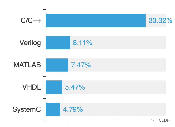 C/C++是芯片开发者中最常用的开发语言,占比33.32%。