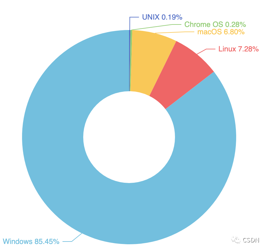 在众多桌面操作系统中,Windows依然是大部分开发者常用的桌面操作系统,占比85.45%。