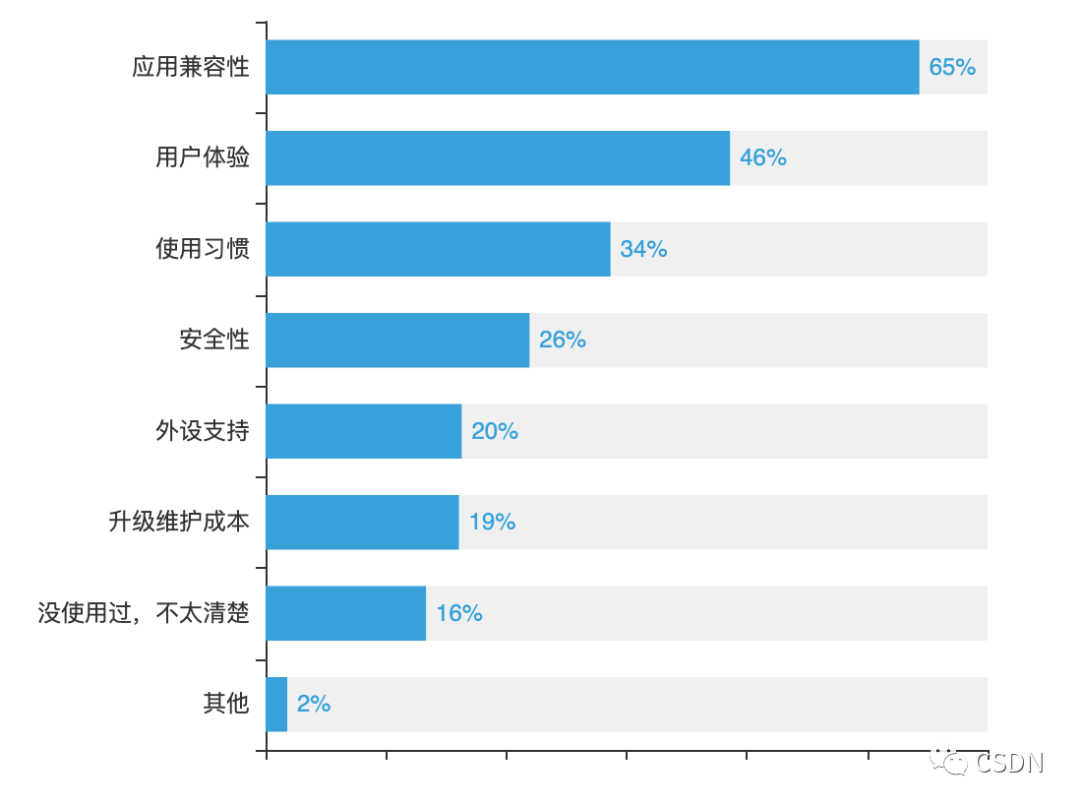 对于操作系统自身特点,65%的受访者表示希望国产操作系统有良好的兼容性。其次是拥有良好的用户体验,占比46%,也有一部分开发者会考虑使用习惯、安全性、外设支持和升级维护成本。