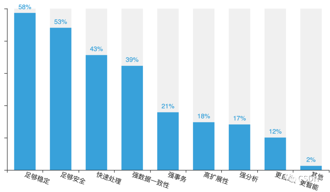 国产数据库近年的迅速发展,为众多开发者留下了深刻的印象,占比31%,另有31%的开发者认为国产数据库缺乏创新(18%)、技术落后(13%)。