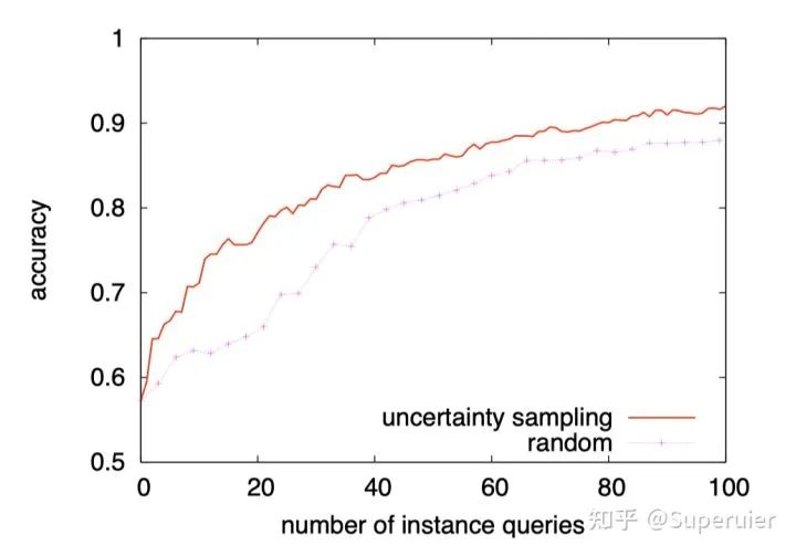 从整个学习过程来看,在相同数目的标记样本下,主动学习选取的表现要好于随机选取的表现。这种可以描绘出整个学习过程的曲线也一般用于对主动学习方法进行评估。