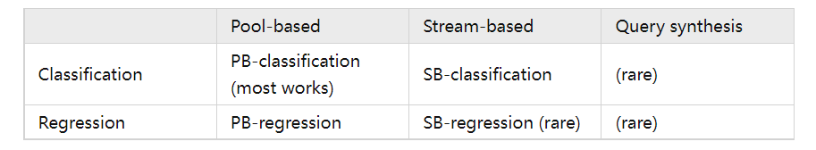 这里我们只讨论最基础的分类和回归问题。在这两类问题下,有着三种不同的主动学习场景: