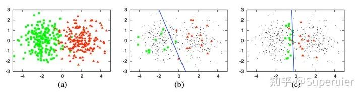 下面是从 Burr 的 Survey 中选取的一个简单的例子,图(c)中使用主动学习策略仅选取30个样本作为训练集训练出的逻辑回归模型即可达到90%的准确率,而图(b)中随机选取的30个样本训练出的模型却相对表现较差。