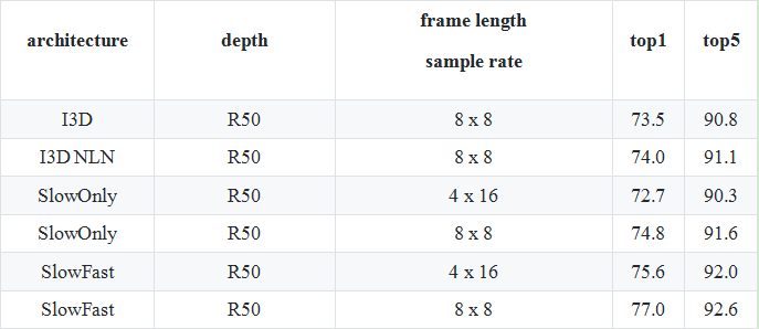PySlowFast 在视频分类数据库 Kinetics 400 上的性能)(节选自 https://github.com/facebookresearch/SlowFast/blob/master/MODEL_ZOO.md)