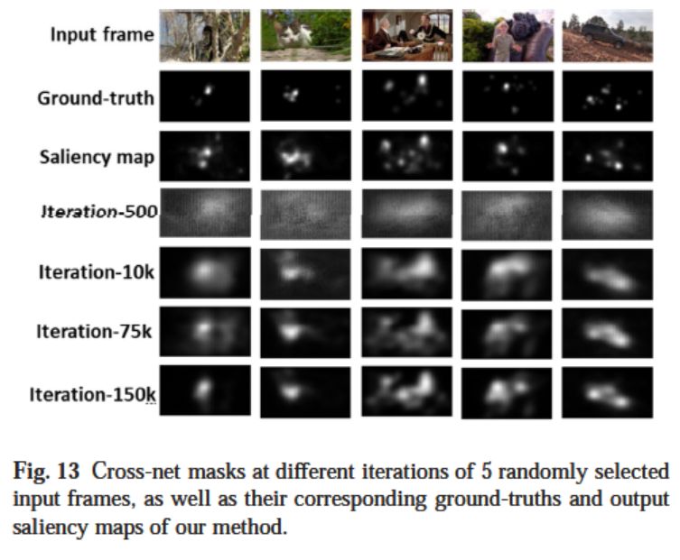 图 7 是对 cross-net mask 的一些可视化结果,第一行是输入帧,第二行是真实人眼关注点(Ground truth),第三行使我们算法的最终输出,最后四行是在训练过程中 cross-net mask 的变化。我们可以看到,cross-net mask 能逐渐定位到物体区域,且在之后训练的过程中变化不大,与预期结果相似。