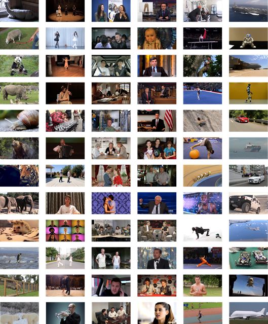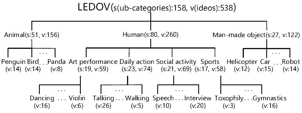 为了保证视频内容的丰富性,我们粗糙构造了基于视频内容关键字的动态树,并基于此在 Youtube 上下载视频,并基于实际情况修改动态树。最终动态树结构见图 3,共计 158 个视频子类,538 个视频片段(部分实例见图 4)。