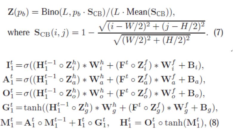 其主体结构是一个双层的卷积 LSTM,用于产生像素级的输出。和传统卷积 LSTM 不同的是,SS-ConvLSTM 考虑到了基于显著性的先验知识:中心先验和稀疏先验。中心先验指的是人们在看视频或者图片的时候往往容易关注到中心的位置。