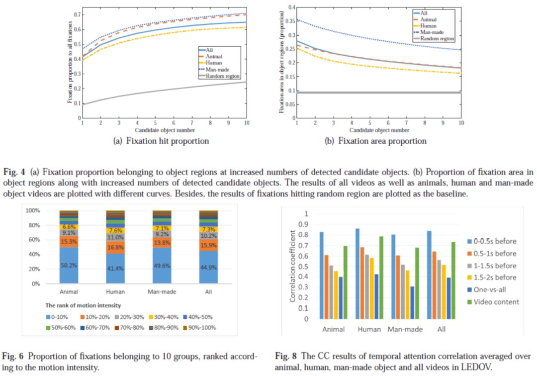 基于采集到的眼动数据,我们进行了数据分析,得到了 3 个非常直观的发现:1)显著性与物体相关性较高;2)显著性与运动的物体以及物体中的运动部位相关性高;3)显著性在帧间会存在平滑的转移。数据分析见图 5。