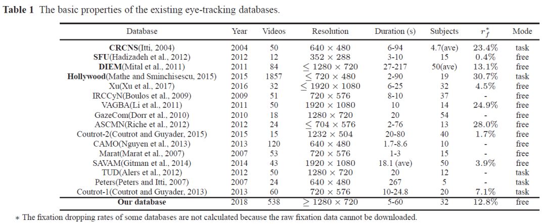 如图 2 所示,已有的数据普遍规模较小,且存在一些如分辨率不高,关注点采样率低的问题。而大规模眼动数据库如 Hollywood(Mathe and Sminchisescu, 2015)中的视频是任务驱使的(task-driven),均是用于动作识别任务的电影片段,而不是普适性视频(general videos)。相比于任务驱使的显著性检测,普适性视频的显著性检测有更多应用场景,然而此类显著性检测方法和数据库都十分匮乏。