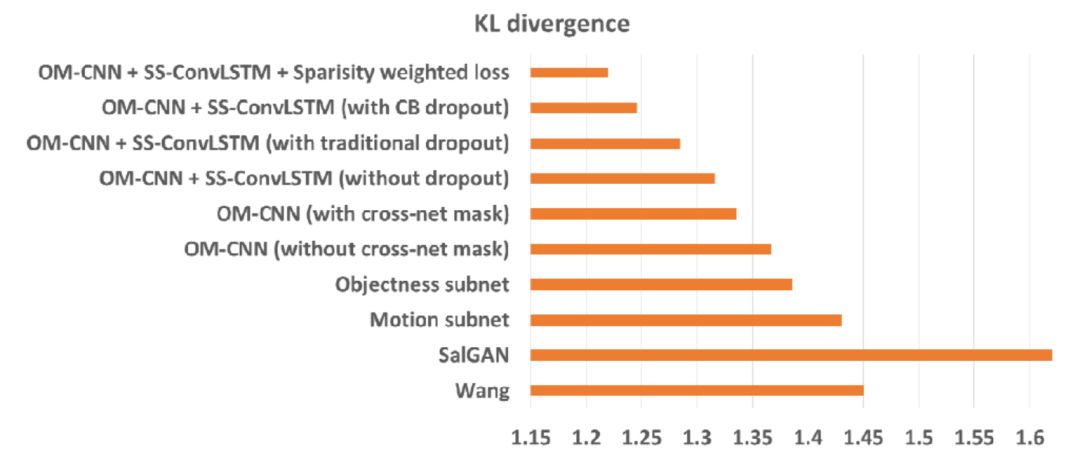 原文也罗列了 DeepVS 和对比算法在另外两个常用眼动数据库 DIEM 和 SFU 上的实验结果。DeepVS 仍超过所有对比算法,有不错的泛化能力。图 13 展示了 DeepVS 的溶解实验,可以看出,DeepVS 中提出的网络结构或者组件均对最终的结果有所增益。