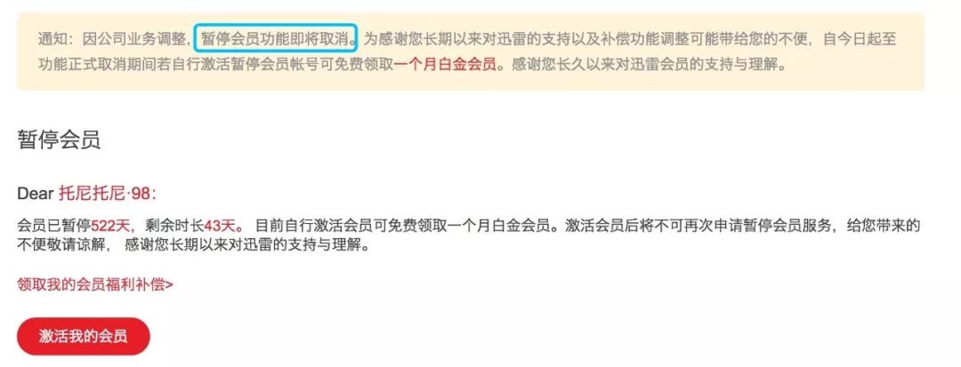 由于笔者换了苹果本之后就再也没有使用会员,便将其暂停了,今天登陆迅雷会员发现了一则公告。