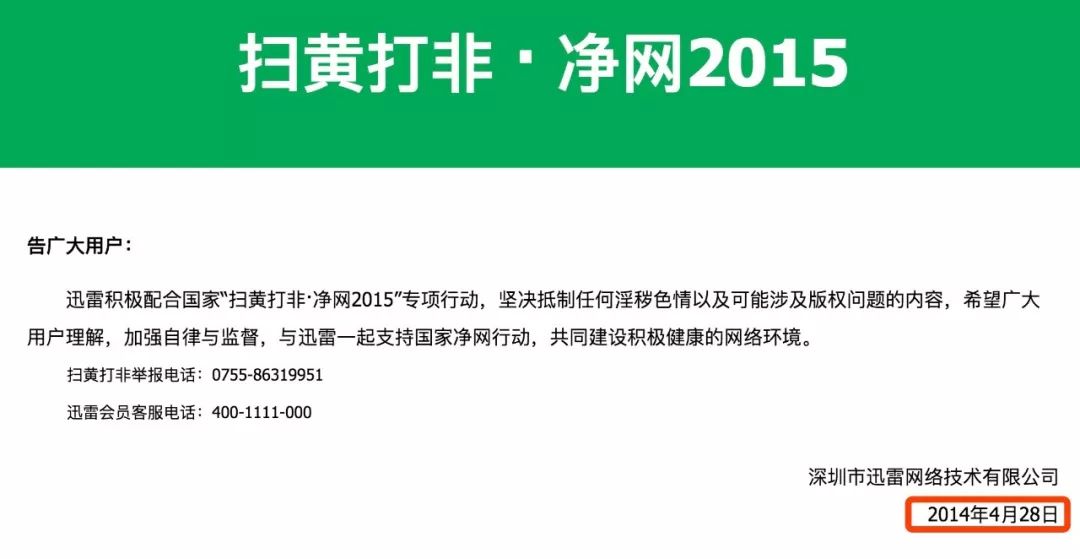 事情当然不会有那么简单,时值迅雷上市前两个月,国家发起了「净网行动」。主管部门要求互联网公司彻查服务器中可能存在的黄反资源,然后删除。自查自报以后,由主管部门检查,后来「快播」没有达标。
