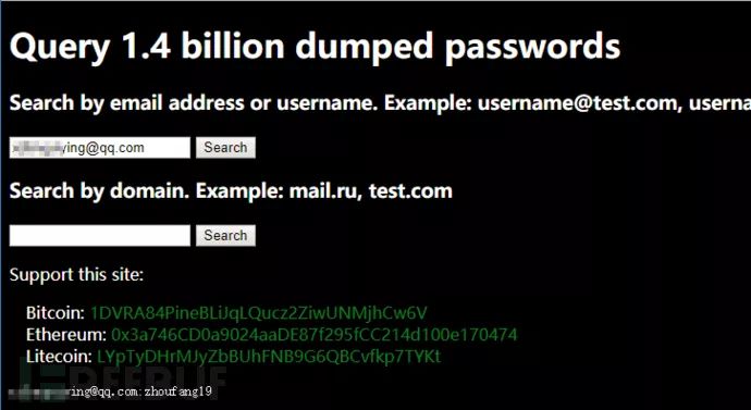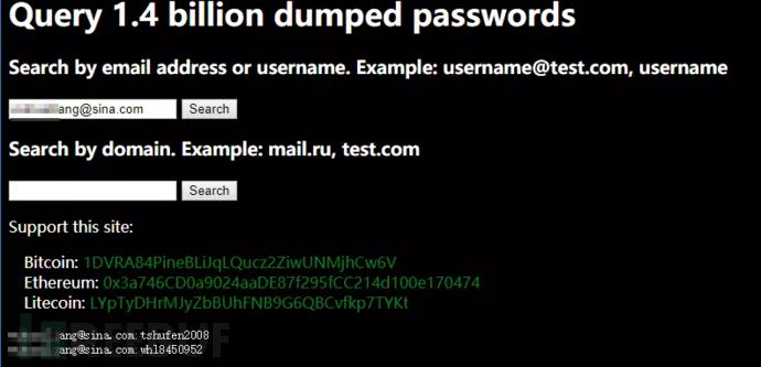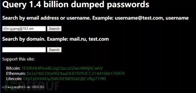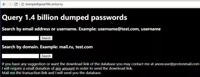 近期,网络上出现了一个14亿邮箱密码泄露信息查询网站:http://dumpedlqezarfife.onion.lu/(点击底部阅读原文访问),访问网站后,可以按照用户名或邮箱地址来查询特定邮箱是否存在密码泄露,查询结果全为明文状态的泄露密码信息。