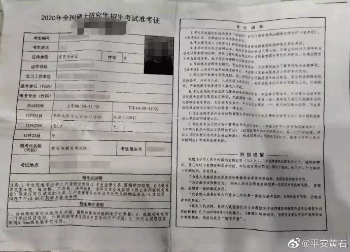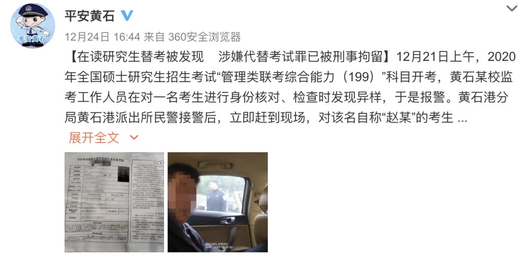 据@平安黄石 12月24日发布消息!12月21日上午,2020年全国硕士研究生招生考试“管理类联考综合能力(199)”科目开考,黄石某校监考工作人员在对一名考生进行身份核对、检查时发现异样,于是报警。