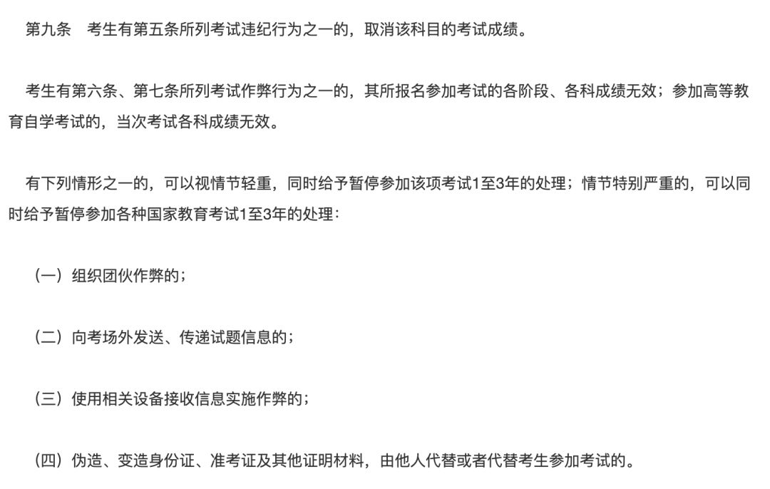 中国青年报(ID:zqbcyol)记者查询教育部公布的《国家教育考试违规处理办法》得知,该办法第九条规定: