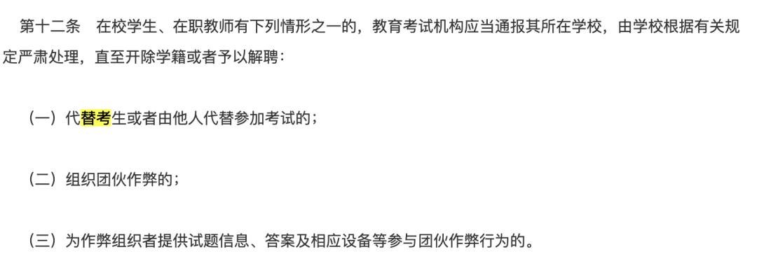 第十二条规定:在校学生、在职教师代替考生或者由他人代替参加考试的,教育考试机构应当通报其所在学校,由学校根据有关规定严肃处理,直至开除学籍或者予以解聘;