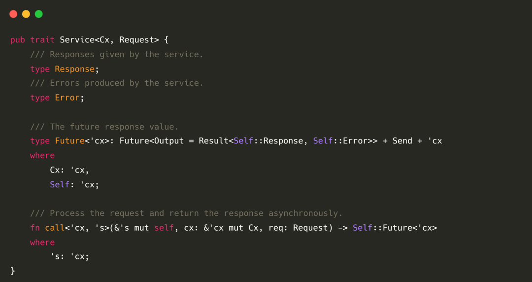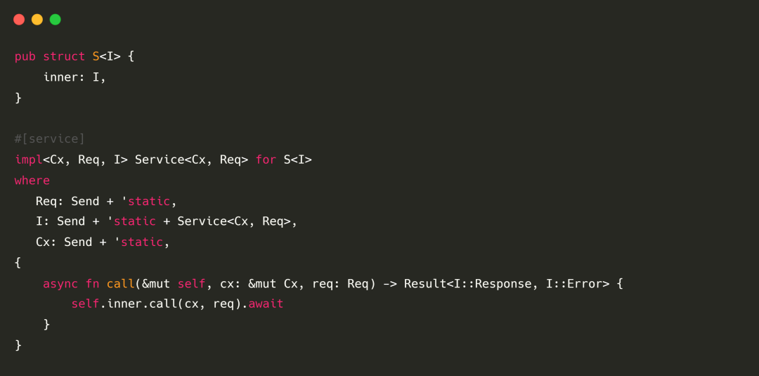我们还提供了 #[service] 宏(可以理解为不需要 Box 的 async_trait)来使得用户可以无心理负担地使用异步来编写 Service 中间件。