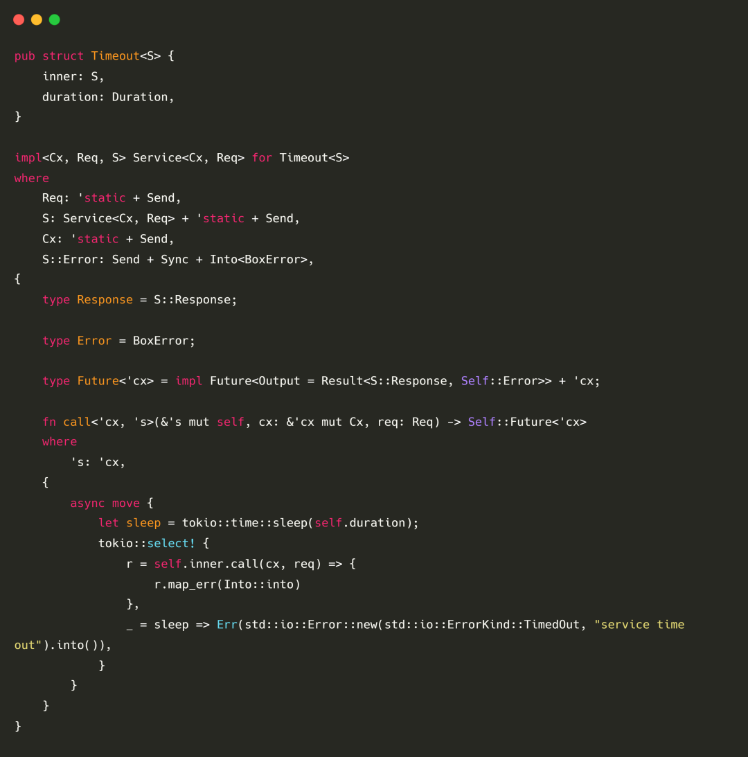 由于使用了 Rust 的 GAT 特性,因此我们可以解决返回异步 Future 带来的生命周期问题。同时,如果配合 type_alias_impl_trait 使用,效果更佳,比如实现 Timeout 可以使用如下方式: