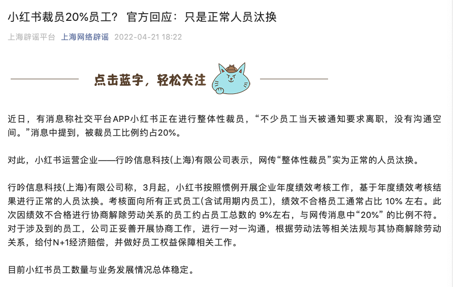 对此,小红书运营企业行吟信息科技 (上海) 有限公司表示,网传“整体性裁员”实为正常的人员汰换。