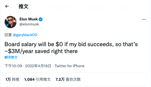 对此,马斯克回复称:“如果我成功收购 Twitter,董事会成员的薪水将为 0,这相当于每年为 Twitter 节省约 300 万美元的费用。”