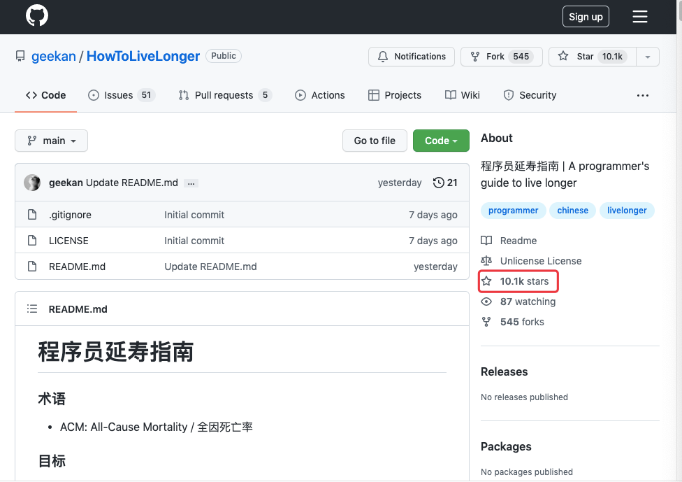 近日,GitHub 上一个名为“程序员延寿指南(HowToLiveLonger)”的项目,一经提交便登上了趋势热榜。目前,该项目已收获了 10.1k+ stars,并且正在吸引越来越多开发者的关注。