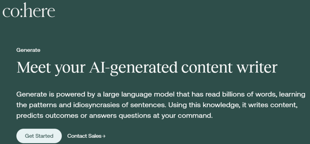 Generate由加拿大的一家NLP公司Cohere开发,模型的工作流程与GPT-3非常相似。