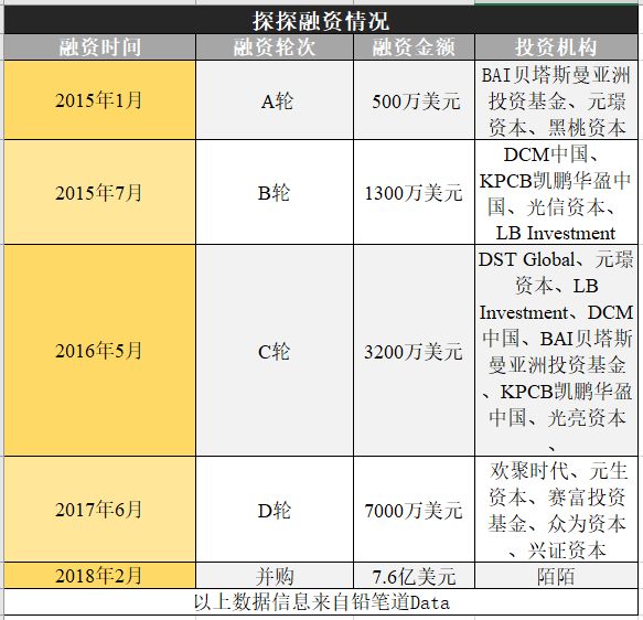 探探共进行了4次融资和1次并购,4次融资累计金额约为1.2亿美元。2015年1月,贝塔斯曼亚洲投资基金(BAI)领投探探A轮500万美元融资;2015年7月,DCM、KPCB、光信资本、LB资本等机构共同投资探探B轮1300万美元融资;2016年5月,DST、元璟资本等领投探探C轮3200万美元融资; 2017年6月,欢聚时代、元生资本领投,赛富投资基金、众为资本等多家投资机构跟投探探D轮7000万美元融资。