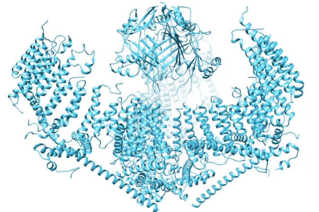 当细胞膜张力改变时,PIEZO可以从合起来的状态变为上图的平展状,带动中间的孔道开放,从而将机械力刺激转化为阳离子流通。