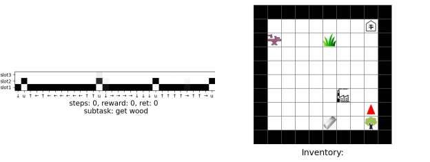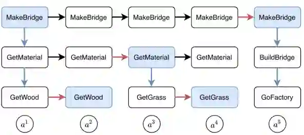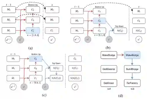 为了能够实现上述的结构,智能体的记忆在每一步应该如何 “更新”?在下图中,将记忆划分为不同级别,对应不同层级的子任务。当‘t=1’时,模型仅从根任务“搭建桥梁” 开始,并 “展开” 得到 “拾取原料”,然后进一步“展开” 为“拾取木头”。这里的 “展开”(蓝色箭头)可以理解成一种“planning operator”,动作从最低层级的记忆中产生。在‘t<3’时,“拾取原料” 会被复制,但是当 “拾取木头” 完成后,即‘t=3’时,该子任务会被 “更新”。这里的“更新” 可以视为每个子任务的内部更新,而 “更新” 后的 “拾取原料” 通过 “展开” 重新得到下一个子任务 “拾取草”。同理“搭建桥梁” 一直被复制直到在‘t=5’(“拾取原料”完成)时进行 “更新”,然后“展开” 为“制造桥梁”和“前往工厂”。