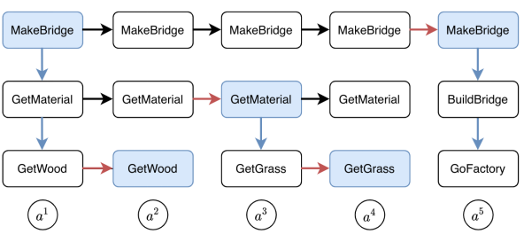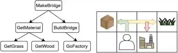 研究者提供了一个网格世界的示例用于说明。示例中有不同的原料(例如草)可供智能体拾取,还包括一家工厂以便智能体使用这些原料。假设智能体想要完成搭桥任务,该任务可以分解为树状多层结构。其中,根任务可以分为 “拾取原料” 和“制造桥梁”。“拾取原料”可以进一步分为 “拾取草” 和“拾取木头”。