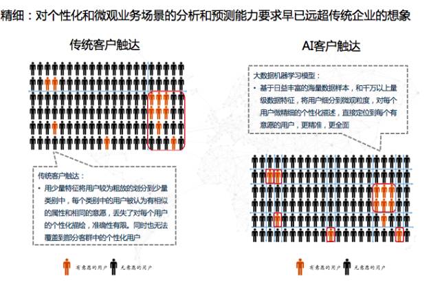 如今,我们利用AI技术,可以实现更加精细的分析和预测。就像上图表示的一样,传统的方式是基于一些规则将人群划分,假设全国有两亿名移动支付用户的话,划分为上百种人群,单一群体就有两千万,丢失了对每个客户的个性化描述。