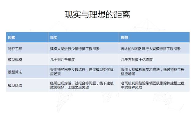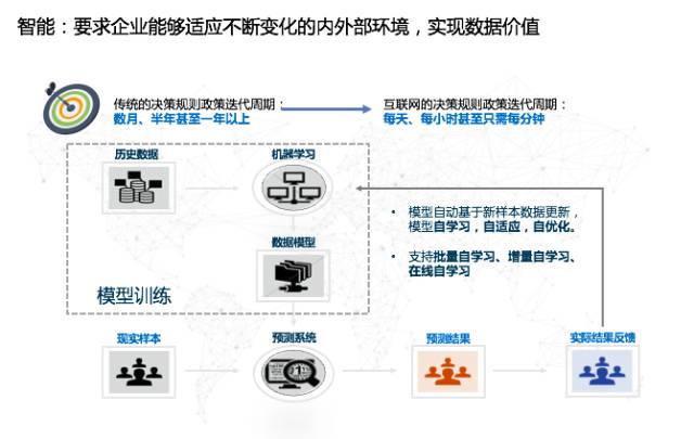 所以,采用专家规则的话,每隔三个月到半年就要对规则进行更新,人工智能则不然,我们可以基于数据做成一个闭环的系统,它能够用机器代替人,从广泛的数据当中筛选出海量的规则,并且规则以及权重可以随着时间(数据)的变化而变化,整个系统就具备了智能(自学习)的能力。
