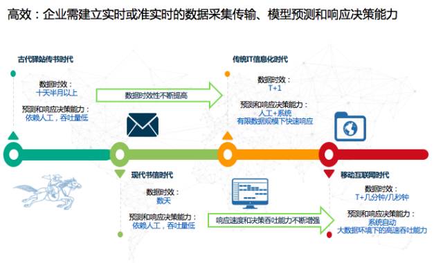 最后一点是高效。之前提及的反欺诈、新闻推荐、营销等领域,它们对实时性的要求越来越高,反欺诈系统必须在几十毫秒之内判定交易是否有问题,营销系统需快速判定客户对某个商品的消费意愿。在某种意义上讲,企业需要建立实时或者准实时的数据采集传输、模型预测和响应决策能力,这样智能就从批量性、阶段性的行为变成一个可以实时触达的行为。