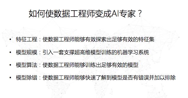如何把一个团队的数据工程师变成AI专家呢?我们认为需要对下图这四个方面进行一些改进。首先是特征工程,它是把原始的数据通过一些方式进行衍生,能够把人群能够划分足够精细的这么一种变量衍生的方式。