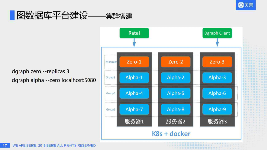 上文提到,搭建Dgraph集群其实非常简单,我们使用docker+k8s技术对Dgraph进行统一的容器化部署和管理。如图使用三台服务器,每台服务器上启动四个节点,其中三个是Alpha节点,就是存储数据、索引、执行查询的节点,一个zero节点,是Dgraph的控制节点;需要注意到的一点是,每个Group的3个Alpha用于存储同一份数据的三个副本,一个Group的不同的Alpha肯定是不能在同一台机器的,而哪几个Alpha组成一个Group是zero根据副本数来确定的,比如dgraph zero -- replicas 3这样启动时候就指定三个副本数,并且根据Alpha的启动顺序来确定。所以有个启动技巧就是,先在第一台服务器上启动Alpha1,然后切到第二胎服务器上启动Alpha2,再到第三台服务器上启动Alpha3,这三个先启动的Alpha组成第一个Group;然后轮流顺序地启动其他的Alpha 4、5、6组成第二个Group,7、8、9组成第三个Group,不能直接在第一台服务器上直接启动123,这样组成一个Group是无法保证高可用的,因为当这一台机器挂掉之后三个副本就全部丢失了。
