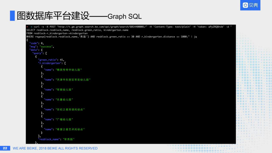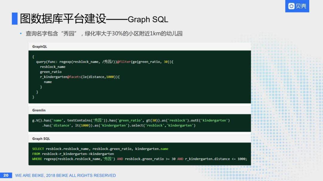 考虑到大部分程序员最熟悉的查询语言就是SQL,甚至不是程序员,一些数据分析师也会SQL,那是否可以使用SQL对图数据库查询?于是我们设计了一套使用SQL查询图数据库的语言,称之为Graph SQL。比如上图最下面的语句:select小区名字、小区绿化率、幼儿园名字;from小区到幼儿园的这么一个关系,此处和SQL有所不同,不是from一个表,而是from一个小区到幼儿园的关系子图;然后where小区名字包含"秀园",绿化率大于30%,距离幼儿园的距离小于1000米。