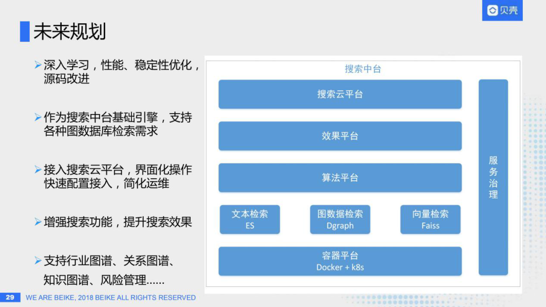 最后简单说一下未来的规划,我这边主要是负责贝壳整体的搜索平台建设,Dgraph建设只是其中的一部分,在整个搜索的架构之下。目前我们已经有基于Elasticsearch的文本检索引擎,以及基于Dgraph的图数据检索引擎,后续还会有基于Faiss的向量检索引擎。