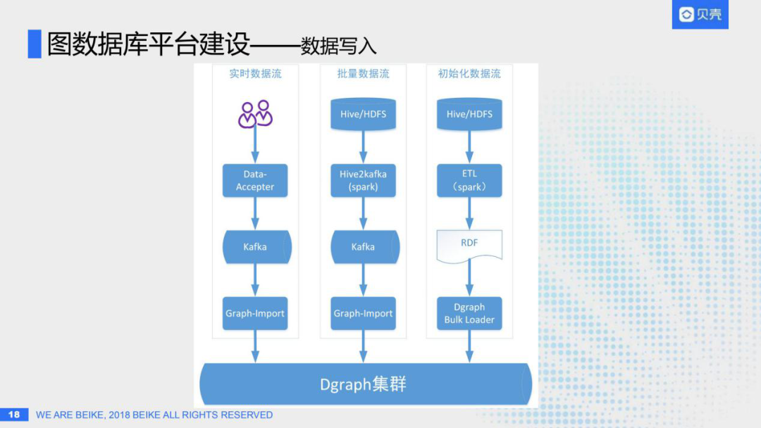 批量数据流模式:比如说要做全量的数据更新,目前贝壳大部分的行业图谱数据都是存在Hive或者是HDFS中的,这时候会有一个Hive2Kafka的spark任务,从用户的Hive表或者HDFS拿到全部的图谱数据,同样写入Kafka,最后通过Graph-Import模块从Kafka取出数据写入Dgraph集群。