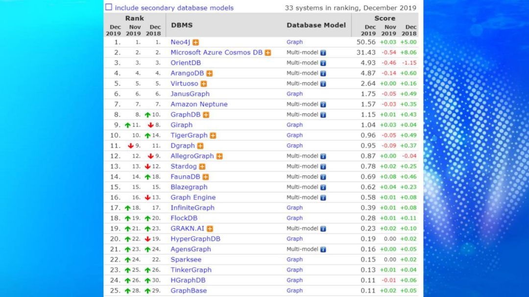这是图数据库领域的各类产品,排名第一的就是大家最熟悉的Neo4j,下面还有很多开源的、闭源的、单机的、分布式的等等各种图数据库,产品非常繁多。