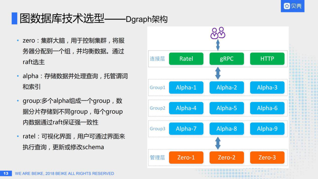 这是Dgraph的架构,它的架构其实非常简单,所有功能都是原生支持的,不依赖于任何第三方系统,右图从下往上看: