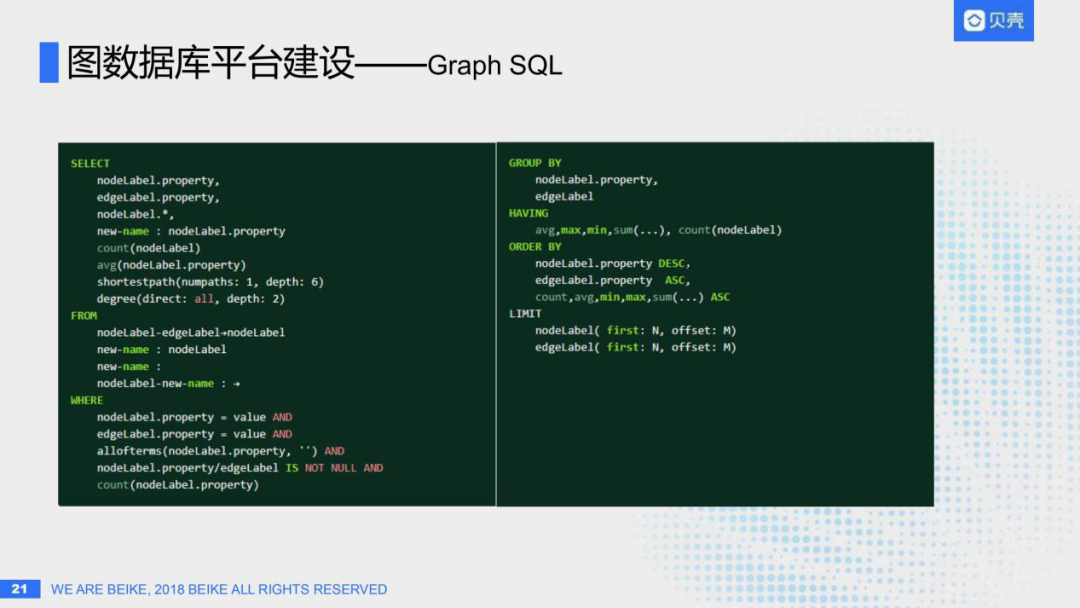 上图为目前我们提供的一个完整的基于SQL查图的语法,增加了一些特定的图的关键字,比如:shortestpath:查询图的最短路径;degree:查询一度关系、二度关系、三度关系等等;然后也支持查点、查边、查节点的属性等等,后面还有GROUP BY、HAVING、ORDER BY、LIMIT等等,LIMIT支持对点、也支持对边进行LIMIT;当然目前只支持了一些简单的语法,后面复杂的查询还在继续完善中。通过支持这种类SQL的查询语法,就可以极大的降低图数据库平台的接入成本和学习成本。