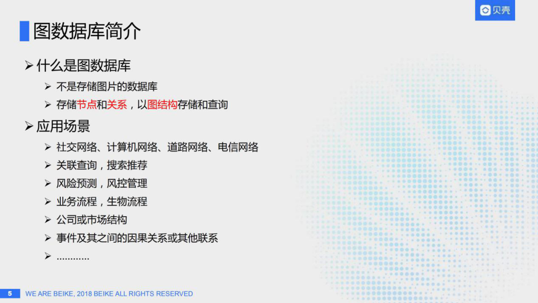 导读:你想知道百亿级图谱如何实现毫秒级查询吗?社区众多的图数据库中如何才能挑选到一款适合实际应用场景的图数据库呢?贝壳找房的行业图谱480亿量级的三元组究竟是如何存储的呢?本文将带你探索上述问题并从中得到解答。本次分享题目为"分布式图数据库在贝壳找房的应用实践",共分为以下五大块内容: