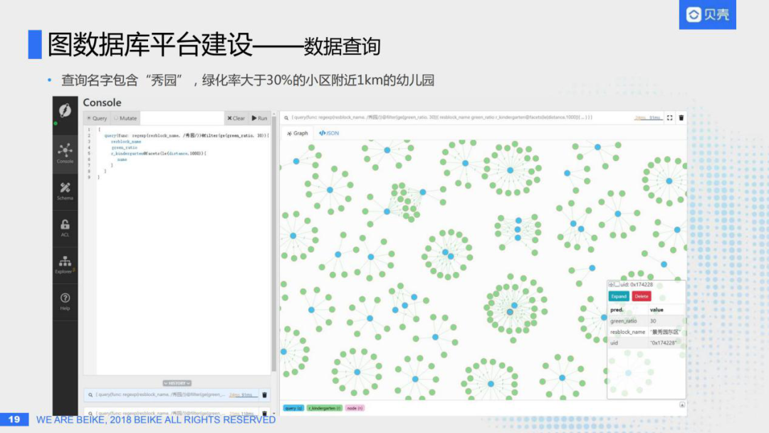完成数据导入之后,接下来就是数据查询了,上图为Dgraph的可视化界面Ratel,左边输入一个查询语句之后,右边就会出现相应图的展示;这个例子是要查出名字包含“秀园”,绿化率大于百分之三十的小区的附近一千米内的所有幼儿园。右边展示图的下面可以看到Dgraph的服务端查询只花了24毫秒,加上来回网络开销总计也就91毫秒,非常的快。